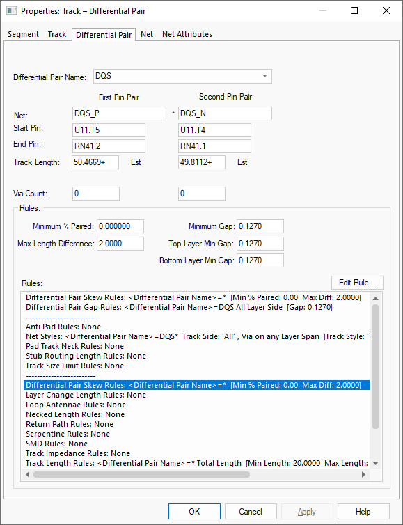 Minimum % Paired shows the minimum percentage paired as defined in the Differential Pair Skew Rules.
