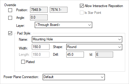 If the mounting hole is in a symbol instance, Override check boxes will be shown next to the Position, Angle and Pad Style edit controls. When any of these are checked and the Locked check box is not checked, the respective controls will become unlocked, allowing for their values to be changed.
