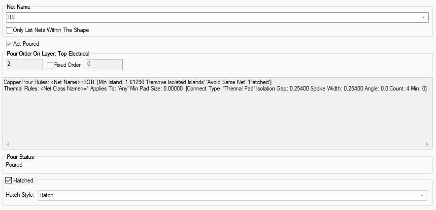 The Pour Status entry will show you whether the selected template currently has copper Poured or Not Poured into it.