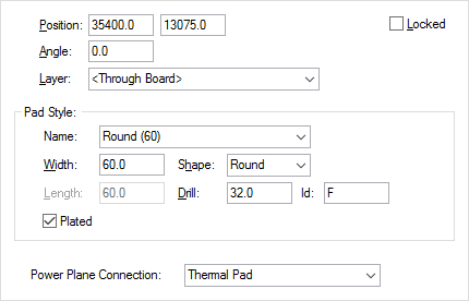 Power Plane Connection allows you to specify how the pad would connect to a power plane or poured copper. The default is to create a Thermal Pad as specified in the Thermal Rules. Alternatively, you can specify that the pad is fully connected or completely isolated from the plane. If it is completely isolated, the gap is determined by the Pad to Copper spacing rules.