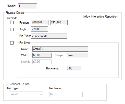 Selecting the Allow Interactive Reposition check box to will allow repositioning during interactive operations such as move. With this checked, the pin will be locked against repositioning. When a component with pins is added to the design, all pins will initially have Allow Interactive Reposition switched off, and so they cannot be accidentally moved. By default this is unchecked to not allow interactive repositioning.