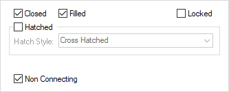 A Closed and Filled shape can be Hatched by checking the Hatch box. You can then select the appropriate Hatch Style from the dropdown list. The hatch lines are drawn in the current Line Style defined for the shape, and the distance between the hatch lines is determined by the width of the line style and the coverage defined in the hatch style.