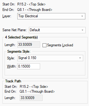 The Layer field shows the electrical layer on which the track appears. To change, select an alternative layer from the dropdown list. Changing the layer of the selected segments may introduce vias.