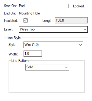 The Insulated check box shows if the wire is marked as insulated. Insulated wires are allowed to be crossed. Non insulated wires can be checked for crossing using the Design Rule Check tool. Insulated wires can be reported separately using the Report Maker.