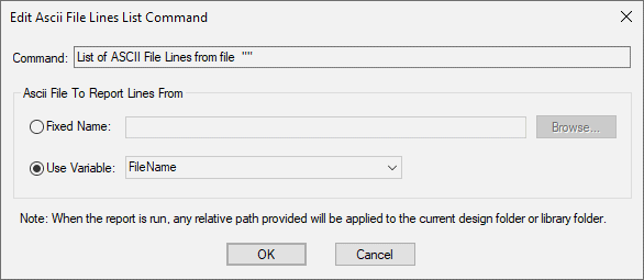 This command could be used in an Insert User Report to display the current contents of an Ascii file in the design. The file path could be provided by an attribute of the inserted report symbol. See Passing Attribute Values To Drawn Reports for more details on how to do this.
