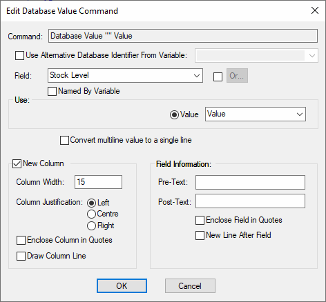 To select the Database Value to be reported you must enter it into the Edit Database Value command dialog. If the required database field matches a loaded attribute name you can select it from the Field drop down list, alternatively any known database field name may be typed directly into the Field edit box.