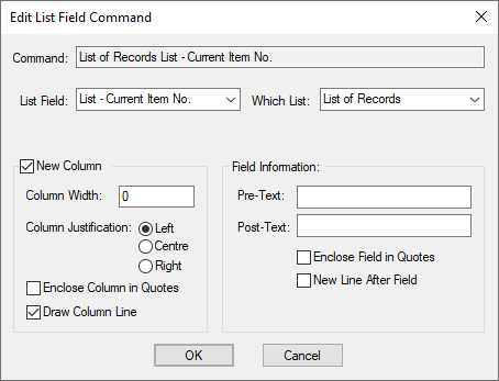 Use this dialog to define an list field command to be used in a Formattable Report.