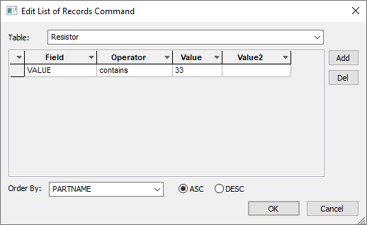 Each row in the grid represents a SQL filter. This allows you to refine you query to report specific items. To add a row to the table, use the Add button. This will insert a blank row where you can start creating a filter by altering the values of each column. To delete a filter, select a row or column from the grid and click the Del button. This will remove that row from the grid.
