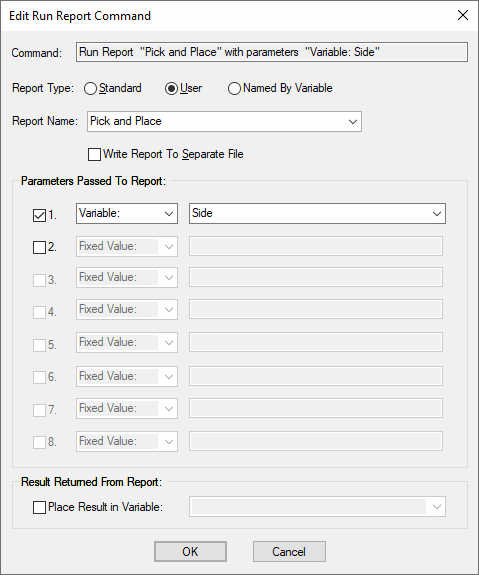 Place Result in Variable - Check this box to supply the name of a variable to hold a value returned by the user report you want to run. In the dialog shown above the return value from the “Pick and Place” report is the number of components output, and at run time this value will be placed into the variable called “Count” after the report has been run so that it can be used by the parent report.