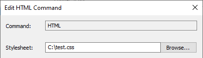 Double clicking on the command will open the Edit HTML Command dialog. From here you are able to browse for and attach a Custom Style Sheet (CSS) which will be used when generating the report. This will be a standard formatted HTML CSS file. If no Style Sheet is present, then the report will generate without it.