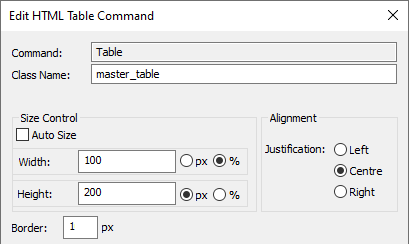 - Width - When Auto Size is not checked, you can define the table width in either pixels (px) or percent (%) units