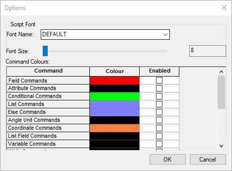 You can define the colours of each command type using the grid. There are two sets of colours for every command type; one is for light mode and the other is for dark mode. Depending on your current application look, the colours defined in the grid will be saved to that mode. For example, “Field Commands” can be set to the colour red in dark mode and blue in light mode. These colours will automatically load when Report Maker is run in that mode.