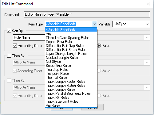 Use this at the top level of the script to report information about each rule of a specified type in a PCB or Schematic design. It can also be used within a List of Nets, List of Signal Paths, List of Sub Nets, List of Differential Pairs and List of Differential Pair Chains to list the rules that are used by the particular item.