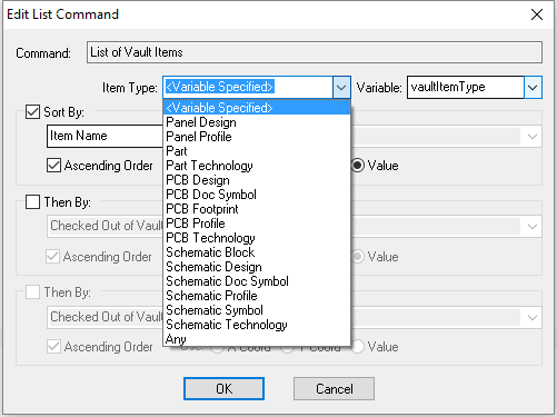 Latest Revision In Vault and Latest Revision Date In Vault - When used within the List Of Parts, List Of Components, List Of Symbols, List Of Doc Symbols or List Of Associated Parts command on a design, they can be used to report the latest revision name and date in the vault so that they can be compared with the revision name and date of items in the design. These commands need access to the vault to work. Note, the date commands should be copied to variables of type “Number” when used for comparison to avoid wrong text comparison. The number will be zero if the item was not found. These commands can be used to check a design to see if it has the latest revisions of its parts etc.
