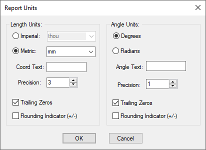 Use this dialog to define the coordinate and angle units to be used in a standard report.