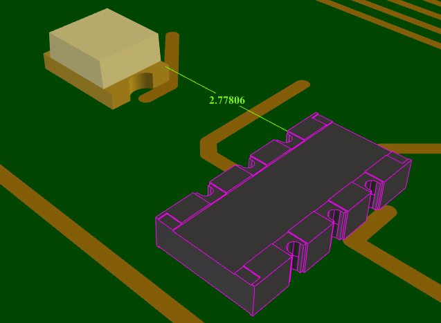 By default, in measure mode, selection behaves as it does normally, allowing complete 3D objects, such as components and enclosures to be selected as the items to measure between. It additionally allows the board substrate to be selected for measuring.