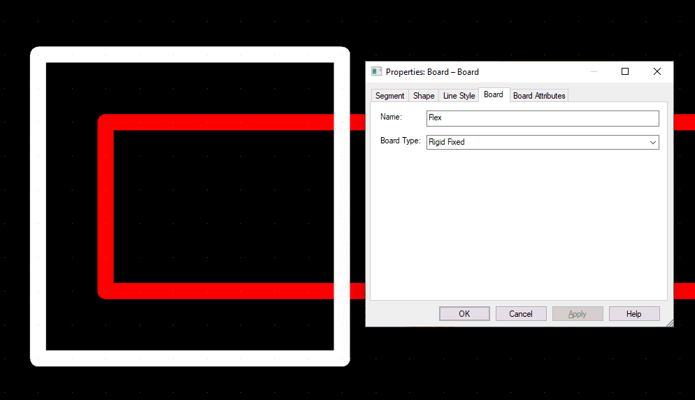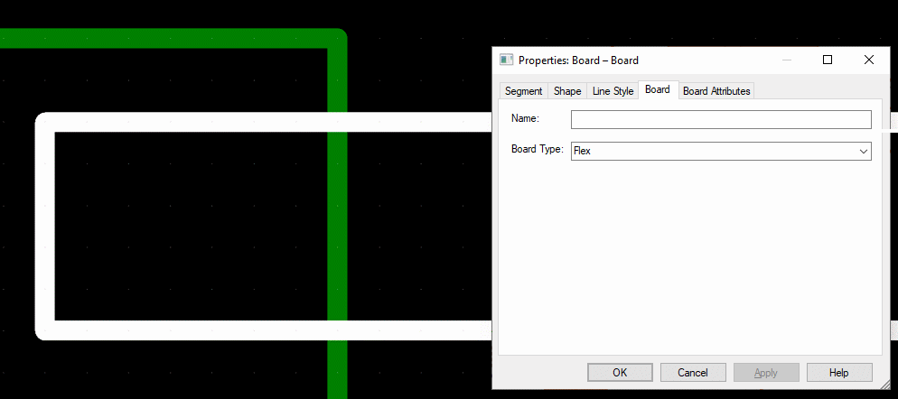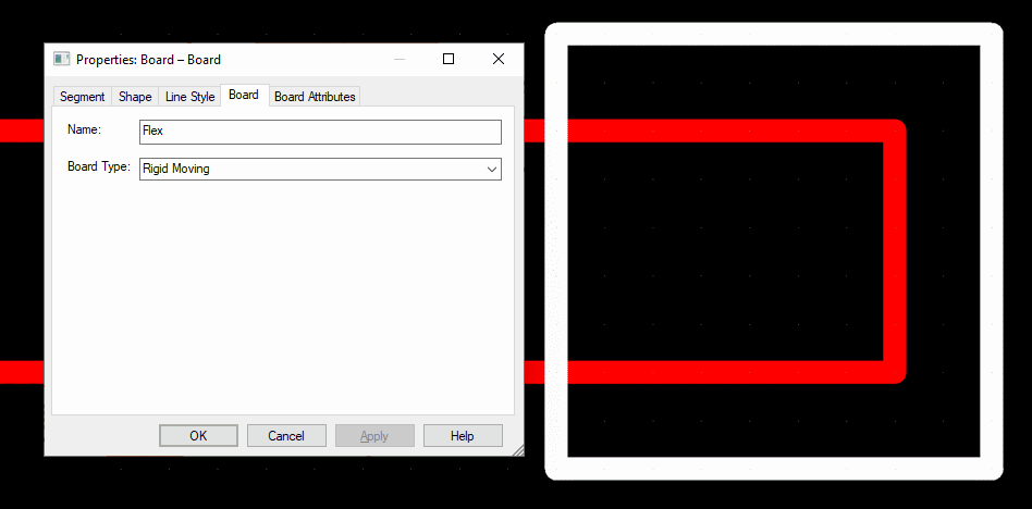 Flexi board folding works by looking at the relationship between board types, and calculates the fold and affected transformations dependent on this. Therefore, the board types need to be initially set up correctly using Board Properties. There are three board types in Pulsonix: