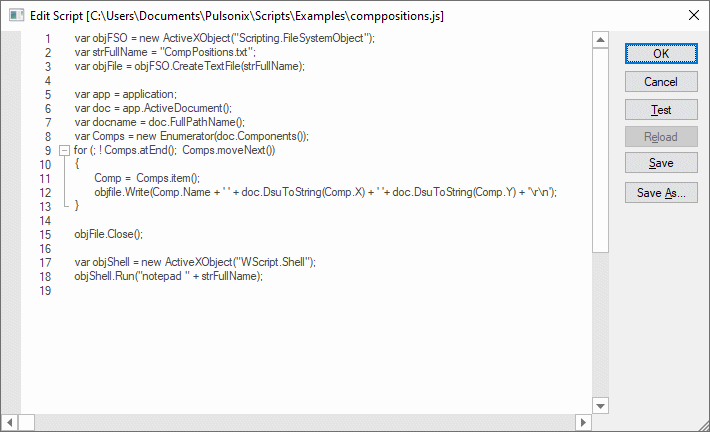 The Edit Script dialog is used to edit the contents of a script file. You can use any application to edit your scripts if you prefer, but this dialog provides a convenient way of making small changes to a script file from inside Pulsonix.