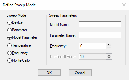 | Model Parameter | Name: Model Name and Model Parameter Name Frequency: (AC, Noise and TF only) |
