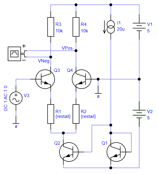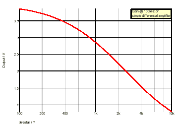 This is a simple long tailed pair. The above circuit resistors R1 and R2 have been given the values {restail}. restail is a parameter that is swept in an AC sweep to plot the gain of the amplifier vs tail resistance at 100kHz. Here is the result of the run: