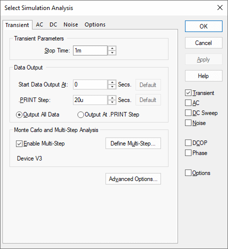 The simulator generates data at a variable time step according to circuit activity. If Output All Data is checked, all this data is output. If Output At .PRINT Step is checked, the data is output at a fixed time step regardless of the activity in the circuit. The actual interval is set by the .PRINT step. This is explained below.