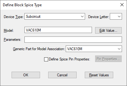 Use this to define the type of Spice device that the selected block instance or Block design represents. If a block instance represents a Spice device then just the device call will appear in the Spice netlist. Otherwise the contents of the block will be included in the netlist.