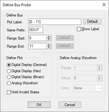 Name Prefix, Range Start, Range End - Defines which nets in the bus are used to created the displayed data. The default is to use all nets defined in the bus, indicated by range value -1.
