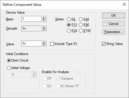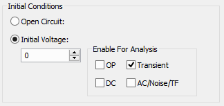 Using this you can supply an initial condition which defines how the device behaves while a DC operating point is calculated. For capacitors you can either specify that the device is Open Circuit or alternatively you can specify a fixed voltage. For inductors, the device can be treated as a Short Circuit or you can define a constant current.