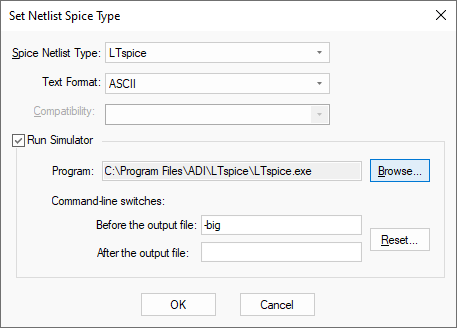 Setting Command Line Switches is optional, setting it to -big will present LTSpice full screen. Using the Reset button will also pre-select the -big command. Other command line switches can be invoked, refer to the LTSpice online help for more information. By default, the the LTSpice simulator will be invoked from Pulsonix and a netlist sent to it and the simulator automatically run.