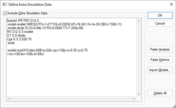 Use this button to paste a copy of all models and sub-circuits used in the design into the extra Simulation data.