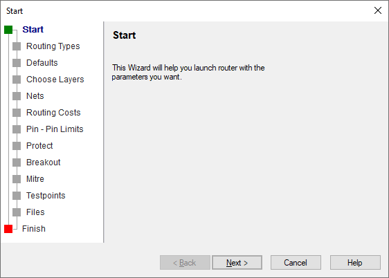 Start | Routing Types | Defaults | Choose Layers | Nets | Routing Costs | Pin - Pin Limits | Protect | Breakout | Mitre | Testpoints | Files | Finish