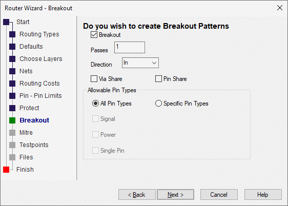 Start | Routing Types | Defaults | Choose Layers | Nets | Routing Costs | Pin - Pin Limits | Protect | Breakout | Mitre | Testpoints | Files | Finish
