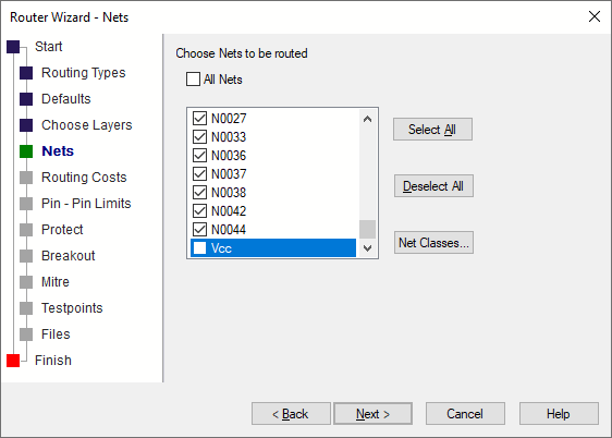 Start | Routing Types | Defaults | Choose Layers | Nets | Routing Costs | Pin - Pin Limits | Protect | Breakout | Mitre | Testpoints | Files | Finish