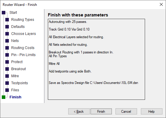this page shows you a summary of the rules set in the Specctra Wizard. You can review all the changes that you have made before pressing Finish to start the router with the specified commands.