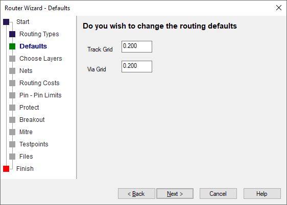 Start | Routing Types | Defaults | Choose Layers | Nets | Routing Costs | Pin - Pin Limits | Protect | Breakout | Mitre | Testpoints | Files | Finish