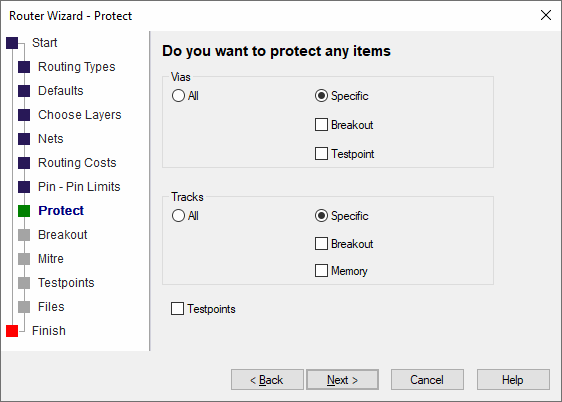 Start | Routing Types | Defaults | Choose Layers | Nets | Routing Costs | Pin - Pin Limits | Protect | Breakout | Mitre | Testpoints | Files | Finish