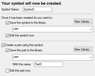 You may want to create a part which uses the new symbol. You can generate a part by checking the Create a part using this symbol option. This is only available if you are saving the symbol to a library.