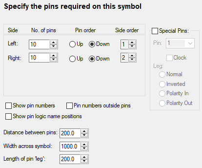 This dialog defines the number of pins on each side of the symbol, and also the direction of numbering. You can experiment with the controls and see the results in the preview window at the right of the dialog.