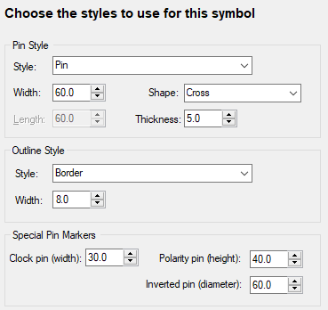 This dialog allows you to define the styles used to draw the pins and outlines in the symbol.