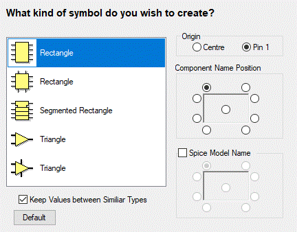 Select the type of symbol required from the list on the left side of the dialog. You can choose the basic positioning of the pin names on each pin, the component and Spice model names.