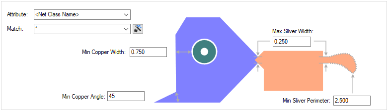 The Min Sliver Perimeter is the minimum perimeter distance from the start to the end of a copper sliver and is checked using the Copper Sliver check in DRC.