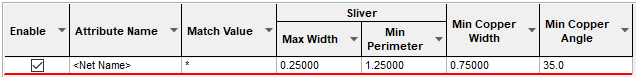 A copper sliver is a long, thin, dangling section of copper that can cause issues during manufacture. The Copper Check Rules dialog is used to define the maximum width and minimum perimeter length of copper (sliver) needed to avoid these features. It also enables you to define a minimum copper angle and copper width to avoid forming copper slivers.