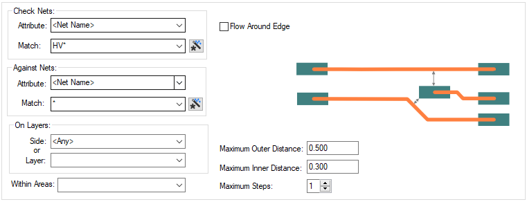 If you have any Areas defined in the design, a rule can be defined for a specific named area. Rules can be defined for any combination of Layers and Areas, as required. If the check is limited by area, then the two ends of the step must be within an area, but the step may be across areas edges, and the edge of the area is not followed (unlike a board edge).