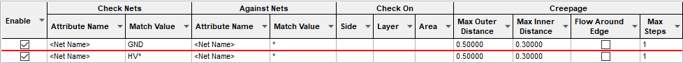 The Creepage Rules dialog is used to specify the rules used when creepage needs to be defined and subsequently checked. The purpose of the check is to report where the total surface gaps could allow creepage between two nets, either directly or through third party copper. You can also check creepage around board edges or cutouts. You can limit this check to a specific layer or named area.