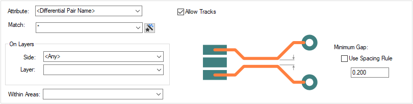 The appropriate gap rule is found for each differential pair by working down the list of rules until the first match is found. Hence, the order of the rules is important. A match is when the specified Attribute Name and Match Value match an attribute of a differential pair, or an attribute on both nets of a differential pair. So the differential pair or nets must have the given attribute, and it’s value must wildcard match the value. In particular, you can match the inbuilt attribute <Differential Pair Name>.