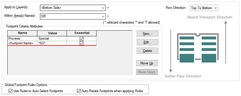 A Footprint Rule can be thought of as having two facets; the first facet comprises of the Layer and/or Area name, this identifies the side (or area) of the board to which the rule applies. The second facet comprises of the rule to which a footprint must match in order to be valid for use. This information consists of a ‘Flow Direction’ which is used when specifying rules for soldering technologies. It can also consist of attributes for more general criteria. These are made up of an attribute name (with wildcard values) that are used to match against attributes defined on the footprints from the library. The use of wildcard characters when specifying Footprint Rules allows a single rule to cover multiple combinations for example, multiple Areas or wildcard footprint names (i.e. \*Wave\* or \*Reflow\*).