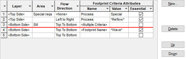 It is important to ensure that rules are in the required order and generally the more specific entries are nearer the top of the table and the general definitions using wildcard names and blank fields are at the bottom of the table. This is especially important when using Footprint Rules within a named Area.