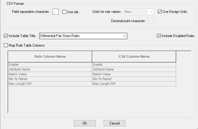 Selecting the Map Rule Table Columns check box will enable a mapping of the rule table column names when Imported to the CSV file. With this check box deselected no table column names are imported. If you import names, the mapping allows either a direct actual name or a user-defined name to be output. The CSV Column Name will identify the name of the column that the corresponding imported column name will be mapped to, this name does not change.