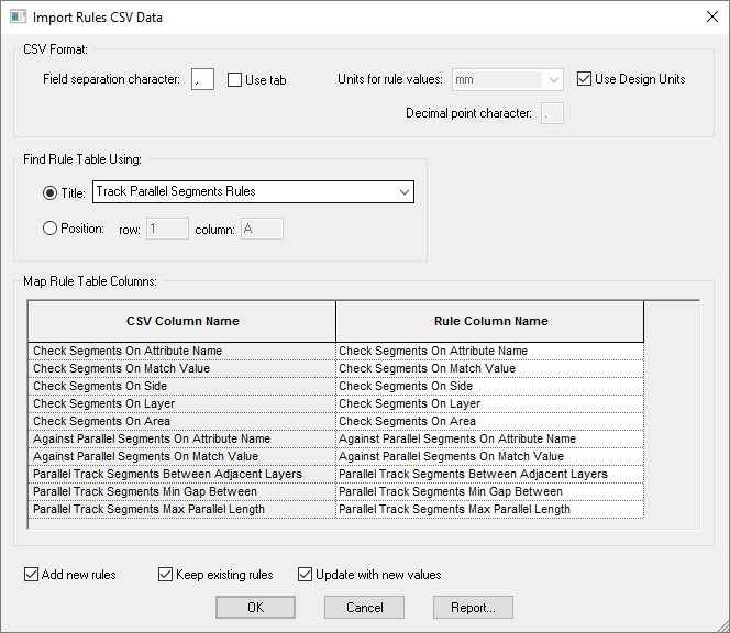 The Update with new rules selection is available only when the Keep exiting rules check box is selected. When existing rules are being imported, the values will be taken from the imported CSV file.