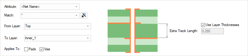 The appropriate layer change rule is found for each net by working down the list of rules until the first match is found. Hence, the order of the rules is important. A match is when the specified Attribute Name and Match Value match an attribute of a net. The net must have the given attribute, and it’s value must wildcard match the value. In particular, you can match the inbuilt attribute <Net Name> and <Net Class Name>. When a net is matched, the rule applies to all the pads, vias, etc on that net. The layer range in the rule is also matched to the entry and exit layers of the track (which could be less than the span of the pad or via). The rule with an exact layer range match will be used as preference.
